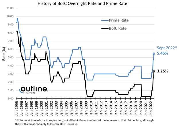 On September 7th, the Bank of Canada increased its overnight rate by 0.75% (75 bp) lifting it to 3.25%. This increase was in line with most economists expectations, and builds on the 1.00% (100 bp) rate hike from July. Lenders will be raising their Prime Lending Rates accordingly increasing from 4.70% to 5.45% (TD Mortgage Prime moves from 4.85% to 5.60%).