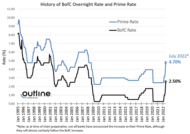 On July 13th, the Bank of Canada surprised many by increasing the overnight rate by 1.00% bringing it to 2.50%. Most economists were anticipating a 0.75% change. Lenders have increased their Prime Lending Rate from 3.70% to 4.70% (TD Mortgage Prime moves from 3.85% to 4.85%).