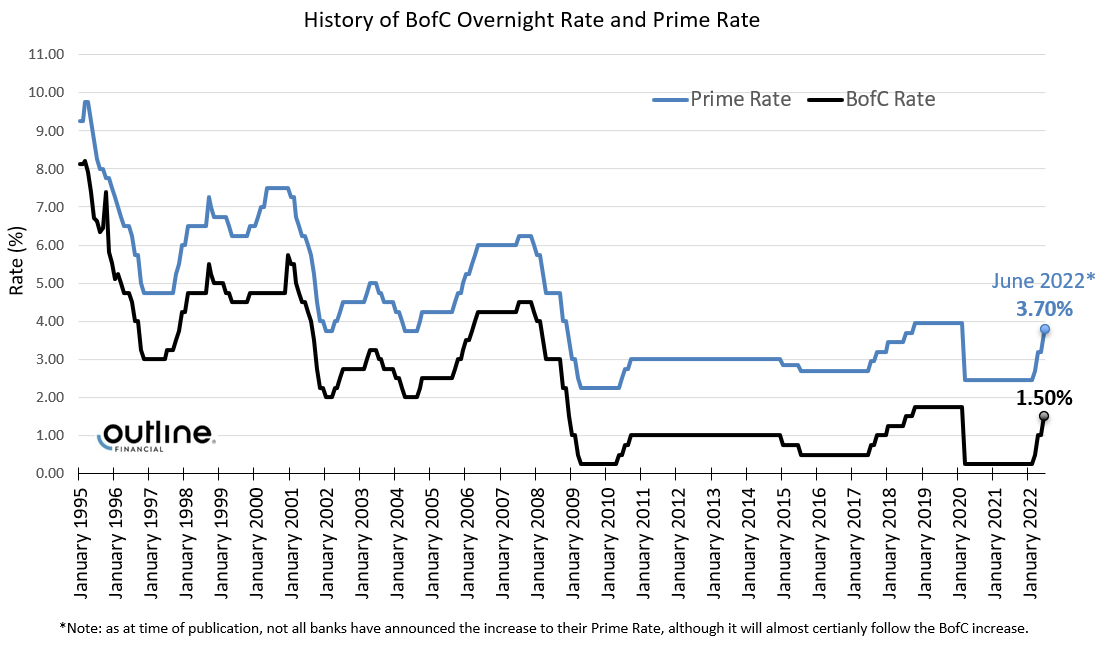 On June 1st, as widely expected, the Bank of Canada once again increased their overnight rate by 0.50% bringing it to 1.50%.  Prime Lending Rate increased accordingly from 3.20% to 3.70% (TD Mortgage Prime moved from 3.35% to 3.85%).