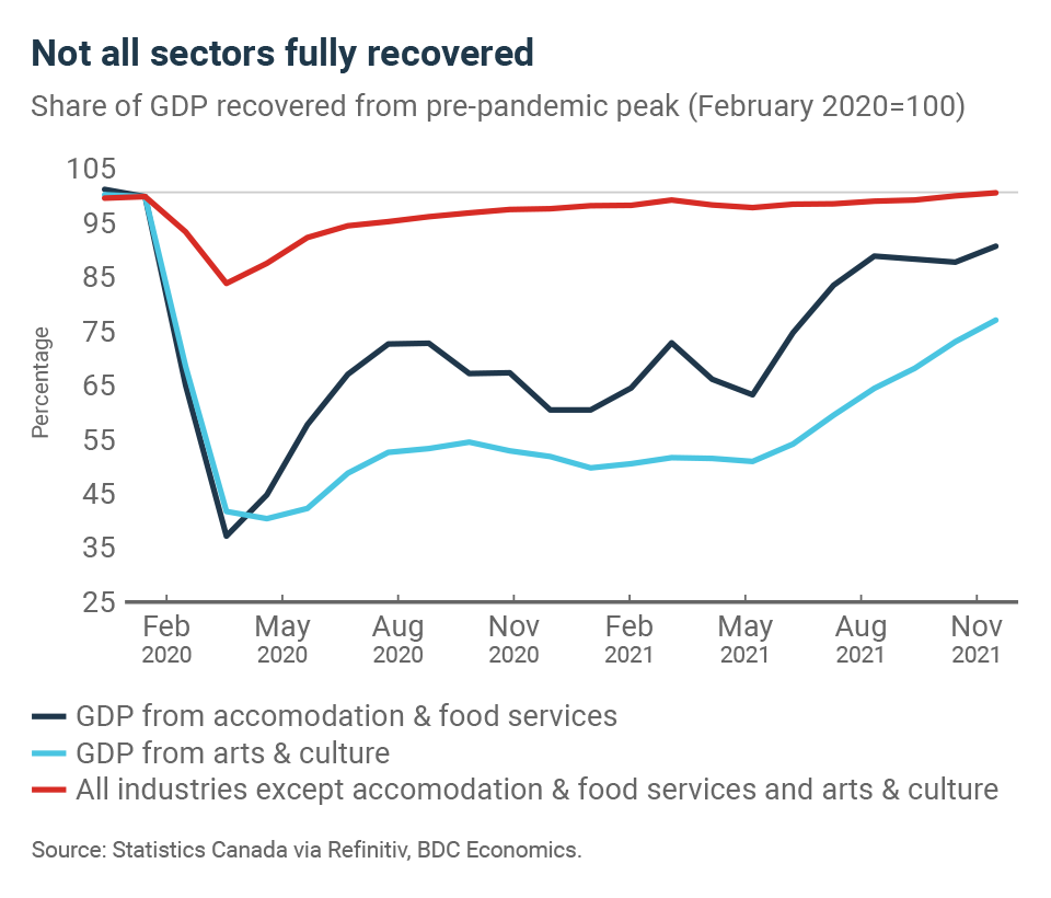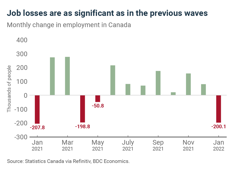 As expected, the labour market is starting 2022 on a sour note. Employment fell in January, the first national decline in eight months. Once again, job losses were concentrated in the sectors most affected by the pandemic, including accommodation and food services (-113,000), and the arts and culture industry (-48,400).