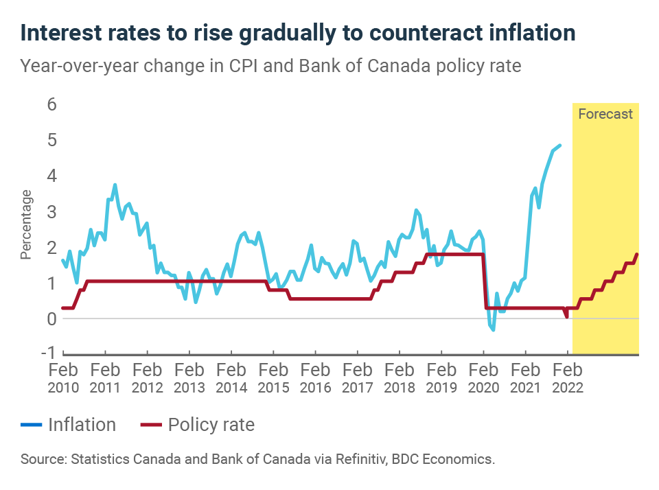 The stage is set for the Bank of Canada to raise its policy rate for the first time at its meeting on March 2. Inflation hit a 30-year high in December at 4.8%. There was still too much uncertainty about the size and duration of Omicron’s impact on the Canadian economic recovery to raise rates at the January meeting. Data capturing the impact of the latest round of lockdowns will still be scarce by the time the bank has to make its decision in March, but according to the provincial plans the economy should be almost fully reopened by then.