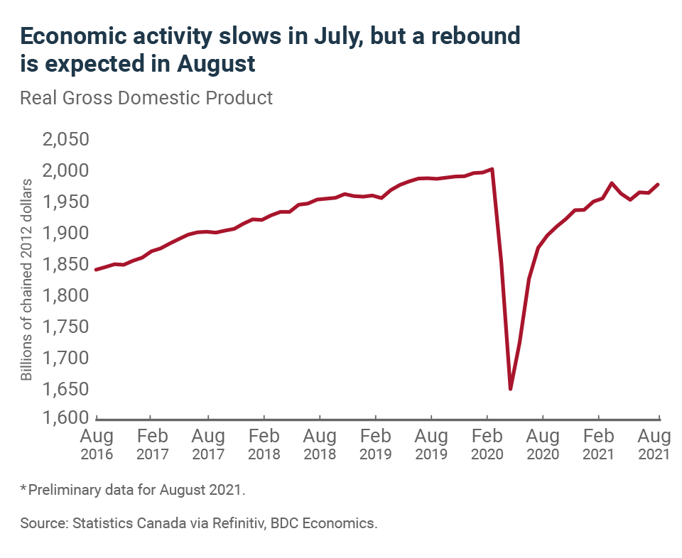 Economic activity stumbled in July, as GDP fell 0.1%, following a 0.6% increase in June. However, preliminary analysis from Statistics Canada indicates that growth resumed as the summer wore on.
