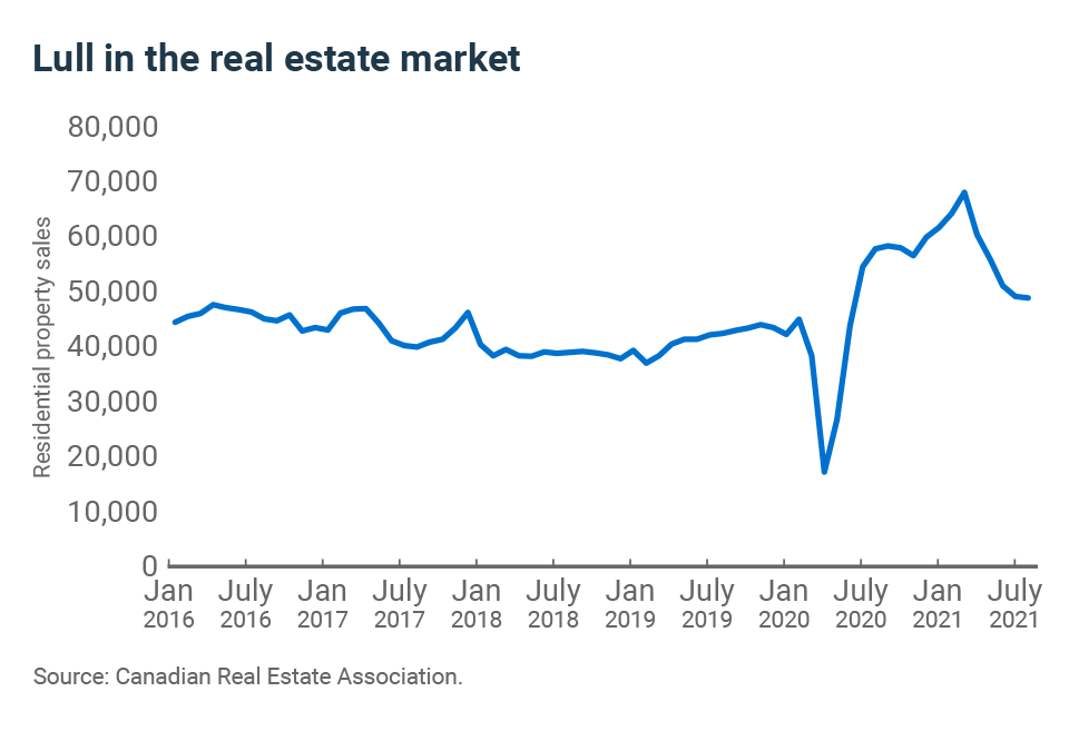 The real estate sector accounts for 13% of Canadian gross domestic product. The sector recovered quickly from the crisis, regaining its pre-pandemic level of activity by July 2020 after having lost only 5% at the height of the crisis.