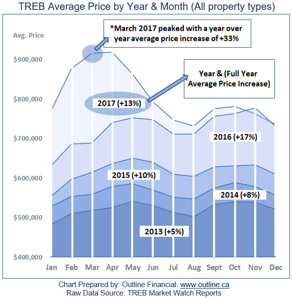 Last March saw Toronto’s average year over year price increase peaking at more than 33 per cent—an unsustainably hot year for real estate prices. Now let’s take 2017 out of the equation for just a moment.