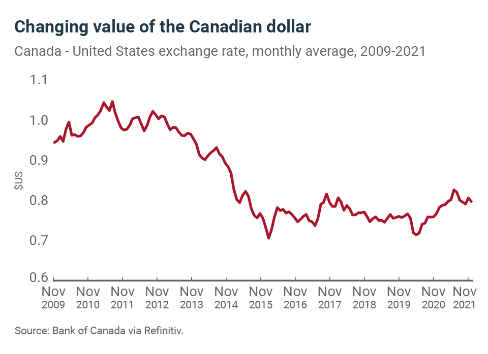 The Canadian currency has hovered around US$0.79 in recent weeks, down from its 2021 annual average. More recently, in early December, the loonie slipped under US$0.78. Although the drop in oil prices is not unrelated to this depreciation, the uncertainty brought up by the Omicron variant in the markets has also contributed to the dollar’s decline against its American counterpart.