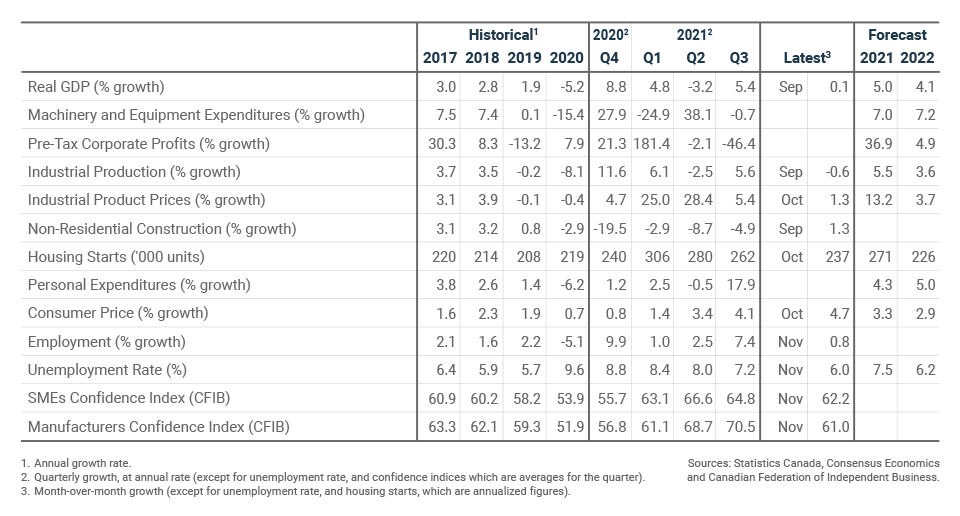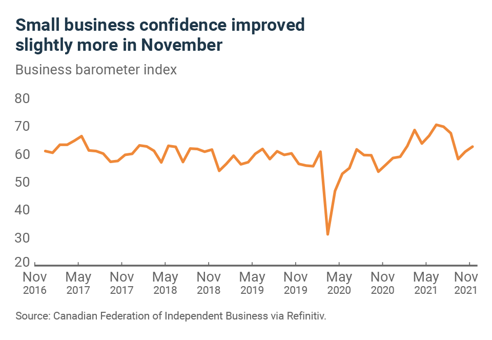 In November, the CFIB’s business confidence index rose a few more points. Since falling sharply in September, the index has yet to return to the high levels experienced during the summer and stood at 62.2 in November. An indicator above 50 indicates that entrepreneurs expect the business environment to improve over the next 12 months. However, the short-term indicator (next three months), despite increasing to 49.8, shows that business owners see the reopenings as positive, although they are aware that challenges remain. In short, business owners are realistic about the economic challenges of the next few months but believe that the economy will recover in the longer term.